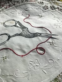 Block printed crane with embroidered thread on vintage doily. Heat-set.